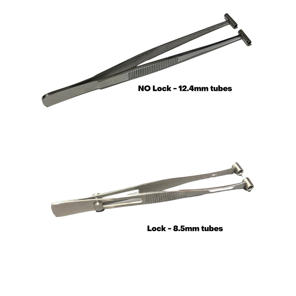 NO LOCK - each tube measure 12.4mm long and is positioned in the middle of the tweezer arm. Overall length 15cm.